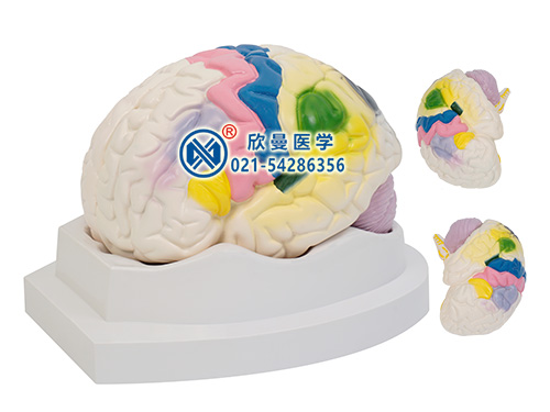 XM-605大脑皮质功能定位模型可拆分为2部件,作正中矢状切面,显示脑干、间脑、脑桥、小脑、脊髓、丘脑、垂体等内部结构以及外部大脑皮层结构,按不同功能部位进行定位,并用颜色加以区别。